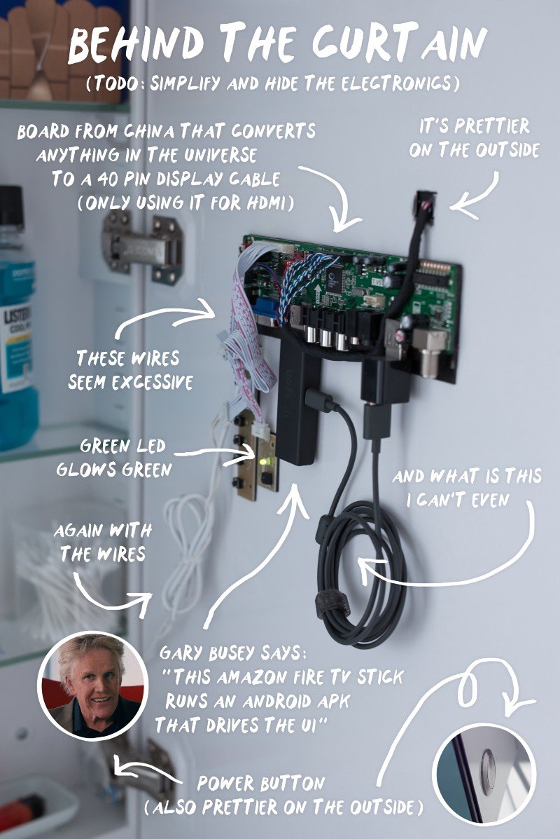 Der Spiegel ist eine Art „Spionspiegel“ mit einem insgesamt 15,6 Zoll großen FullHD-Display. Die weiteren Komponenten, wie das Controller-Board und andere Bauteile hat er sich ganz normal über eBay und Amazon gekauft. Als Herzstück hatte es Brown bereits mit einem Google Chromecast und Nexus Player versucht. Aktuell benutzt er aber einen Amazon FireTv Stick, der wohl auf Grund der Größe wirklich optimal dafür ist. Aktuell ist der smarte Spiegel aber noch nicht voll im Betrieb und wer den Spiegel vielleicht nachbauen will, muss sich noch gedulden. Brown möchte aber für Tüftler später eine eigene Bauanleitung und Video veröffentlichen.